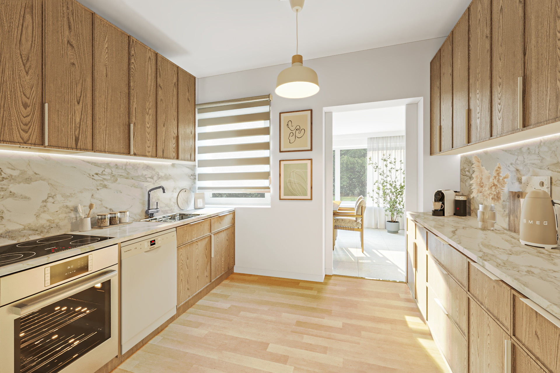 Im Erdgeschoss verbindet ein zentraler Flur alle Räume miteinander: die Küche
