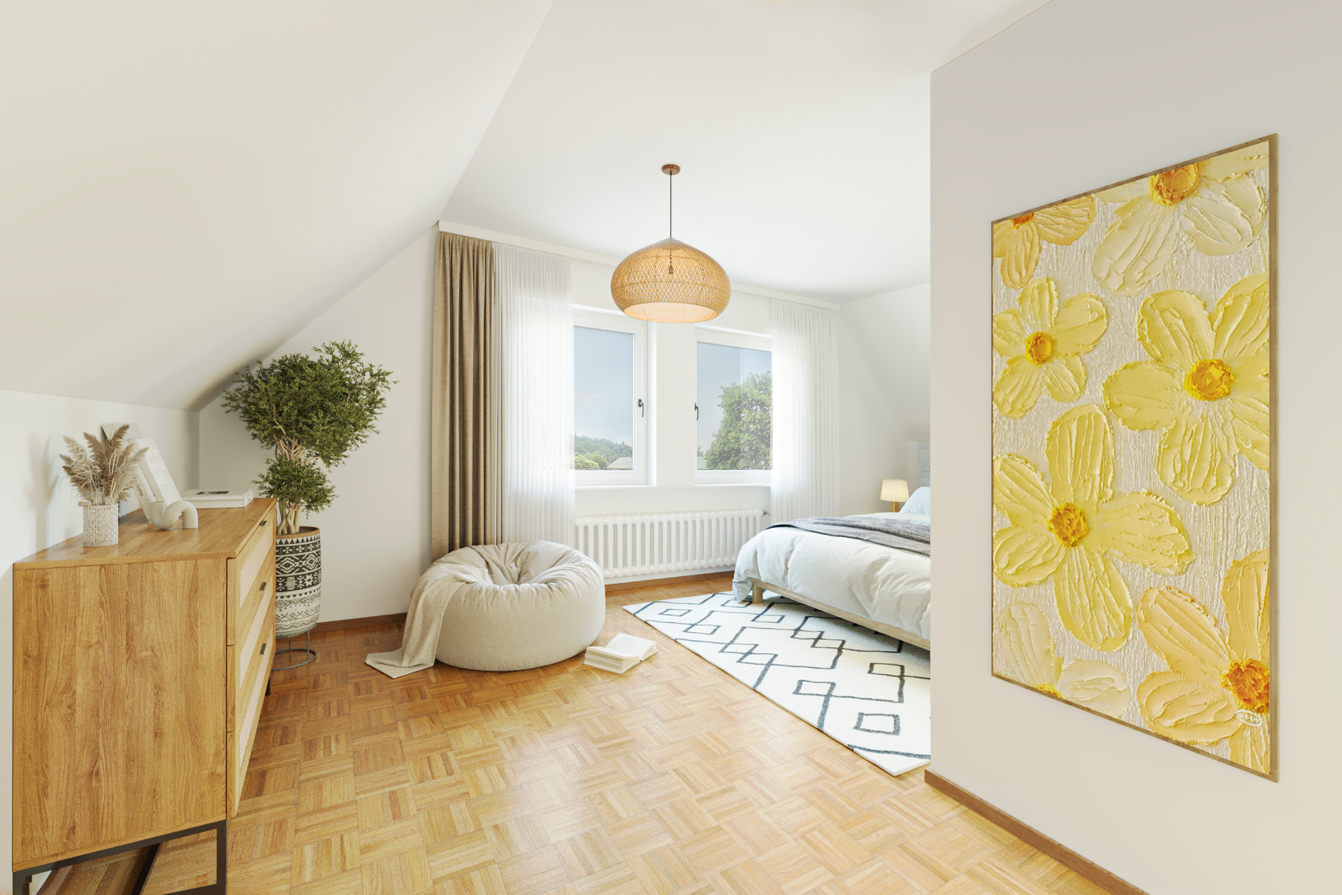 Das Dachgeschoss beherbergt ein Elternschlafzimmer sowie ein Kinderzimmer.